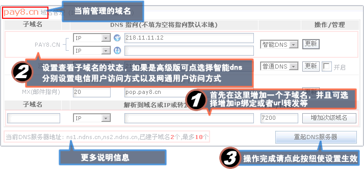 4、高级版本的DNS管理系统具有智能DNS解析功能,增加子域名后,既可选择智能DNS功能,此时同一个子域名就有“电信”和“网通”两个不同的设置选项,您可以有针对的分别设置。